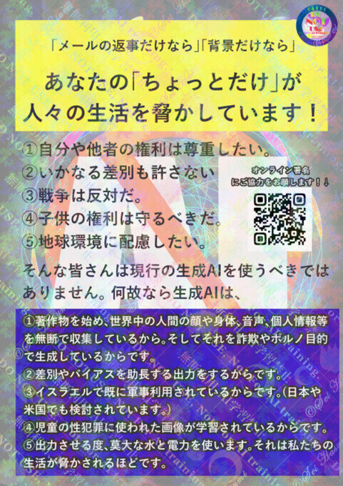 私自身、蓮見セイ名義としては、創作を中心に活動しておりますが、性的被害サバイバーでもあります。生成AIは、クリエイターだけの問題ではなく、世界的な人権問題であり、環境問題であるということがもっと広まって欲しいと願っています。