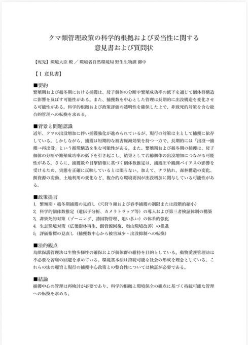 森林開発、再生可能エネルギー事業、インフラ整備等による生息地の改変・分断がクマの行動変化および出没増加に与える影響について検証を行い、人間側の環境変化を含めた総合的かつ統合的な野生動物管理政策へ転換すること。