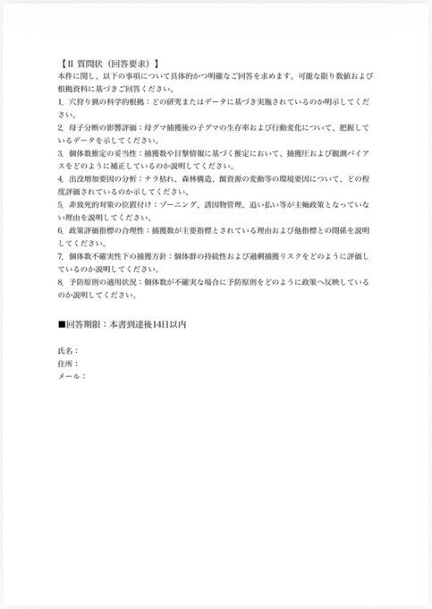 また、春クマ駆除を実施している、北海道、群馬県、青森県、新潟県、秋田県、宮城県、山形県、岩手県、福島県、富山県にお住まいで、ご賛同頂ける方はコメント欄、もしくは、X・スレッドのDMにて県名を言って頂けます。 各県へ提出する際に集計し、県民の声もある事をお届けしたいと考えております。