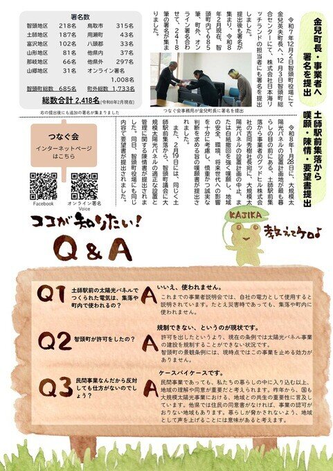 この間の活動報告を「つなぐ通信」第1号としてまとめました。署名活動等を通じて、私たちが住民から直に聞いてきた何気ない質問へのQ&Aも記していますので、ぜひご覧ください。